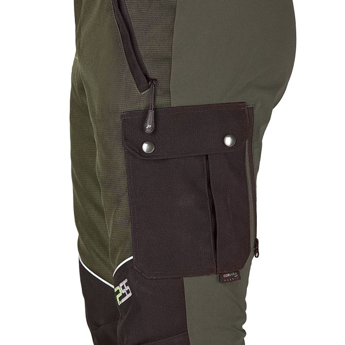 Eine echte Arbeitshose ohne Schnittschutz. Aus hochwertigen Materialien für maximale Robustheit und Komfort. Erfüllt kompromisslos professionelle Ansprüche. Wer eine Arbeitshose für wirklich anspruchsvolle Aktivitäten sucht, ist hier genau richtig. Extrem viel Bewegungsfreiheit und sehr geringes Gewicht, kombiniert mit robustem Cordura®. Weil wir wissen, wie wichtig es ist, dass Wasserdampf problemlos von innen nach außen entweichen kann, vertrauen wir bei der X-treme Work auf eine membranlose Konstruktion. Damit gleichzeitig keine Feuchtigkeit von außen eindringen kann, ist die Oberfläche der Hose WR-behandelt. Die Hose besitzt herausnehmbare Gamaschen mit Schuhhaken, mit denen sie fest auf dem Forstschuh fixiert werden können. Dadurch wird ein Hochrutschen der Hose, z.B. bei Arbeiten in Brombeerschlägen verhindert.